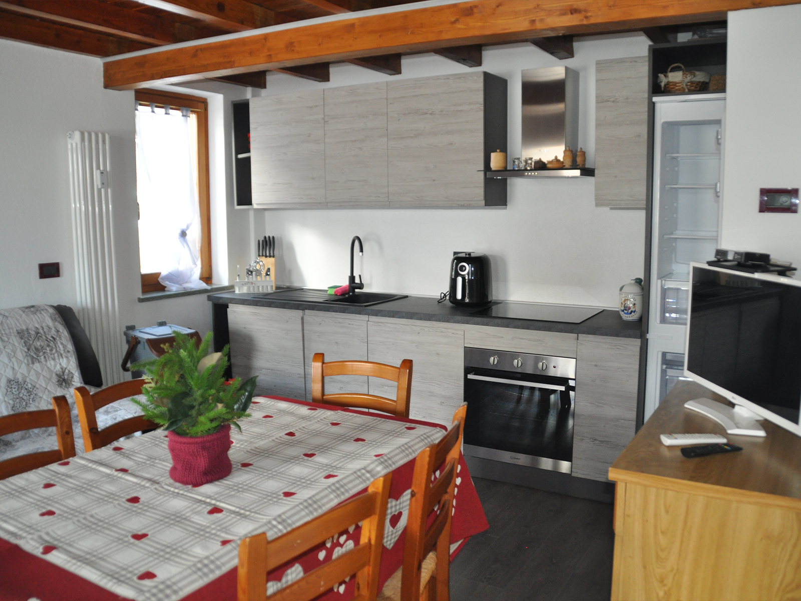 The kitchen is fully equipped with a dishwasher, oven, induction hob, refrigerator, and a large freezer: everything you need to prepare meals independently, even for longer stays.